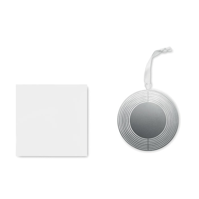 Circular-shaped decorative ornament in stainless steel with ribbon in a gift envelope. Easily folds flat for mailing and storage.