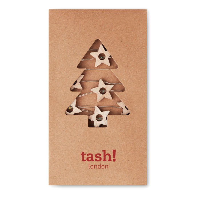 String with 20 LED lights in a wooden star shape. Presented in carton box. 2 AA batteries not included on/off button in battery case.